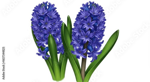 © Md Akter Hossen, Fototapeta premium Two Hyacinth Flowers with Purple Petals and Green Leaves Isolated on White Background for Botanical Illustrations and Springtime Imagery