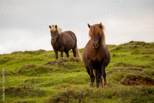 Fototapeta premium Two Icelandic horses standing around in a green field in Iceland.