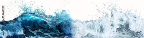 Fototapeta premium two images side by side, one of the left part is a blue wave in ocean, second on right half of picture has white background, hyper realistic.