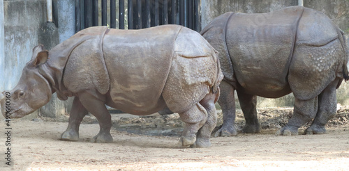 Naklejka premium two indian rhinoceros stands. with blurred background