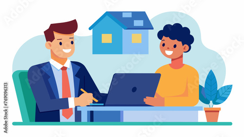 © Justlight, Obraz premium Two individuals one dressed in professional attire and the other in casual clothing sit across from each other at a desk. The lawyer holds a
