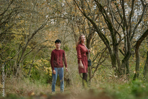 Fototapeta premium Two individuals stand in an autumn forest, facing forward with calm posture,...