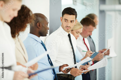 Fototapeta premium Two intercultural managers discussing data on papers among colleagues while...