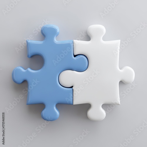 Obraz premium Two Interlocking Puzzle Pieces, Blue and White, on Light Gray Background