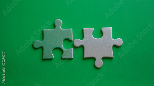 Obraz premium Two interlocking puzzle pieces on a vibrant green background, representing...