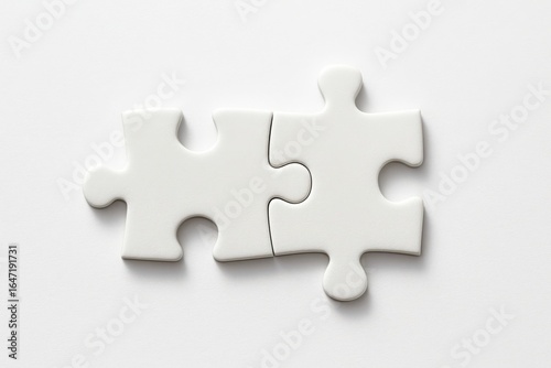 © RONY, Obraz premium Two interlocking white puzzle pieces creating a connection on a clean white background