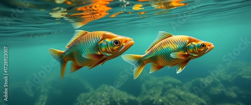 © Anawin, Fototapeta premium Two iridescent crucian carp swim in clear, sunlit water, peaceful, elegant