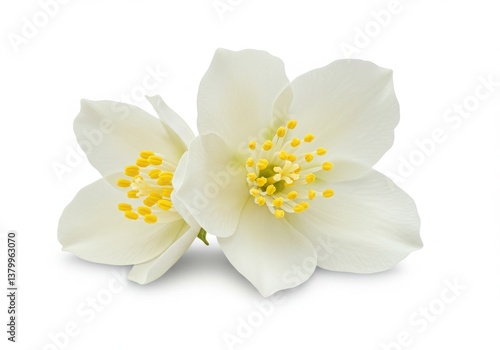 © Laki, Obraz premium Two jasmine flowers with white petals and yellow centers on a white background in soft lighting