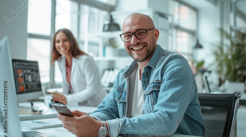 © Studio Nova, Fototapeta premium Two joyful colleagues in a bright office are interacting with each other, one holding a smartphone and the other working at a computer.