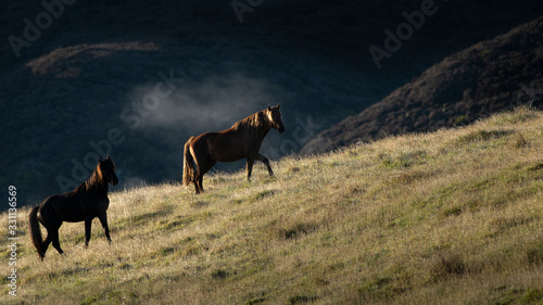 Obraz premium Two Kaimanawa wild horses standing in the morning mist