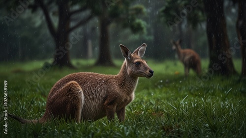 Fototapeta premium Two kangaroos in a green grassy field with trees in the background on a rainy...