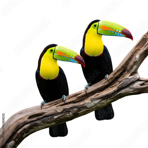 © graphickazi, Fototapeta premium Two keel billed toucans perched on a branch against a black background