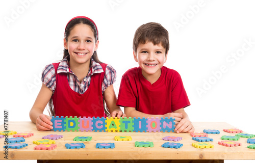 Fototapeta premium Two kids at the table with puzzle letters