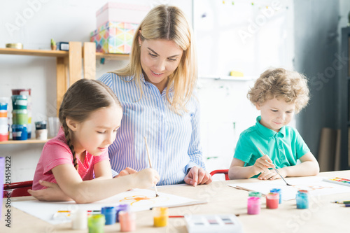 Fototapeta premium Two kids, boy and girl, painting together with their art teacher at the table at art class