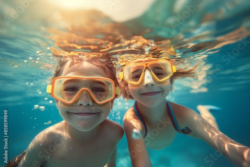 Fototapeta premium Two kids underwater with goggles, smiling and happy