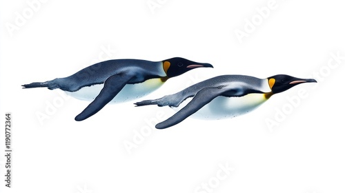 Naklejka premium Two king penguins gracefully swimming underwater, isolated on white.