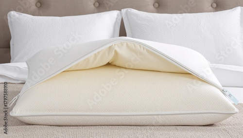 © vxnaghiyev, Obraz premium Two king size Gel Memory Foam pillows on a bed with exposed foam filling, adjustable thickness for personalized comfort