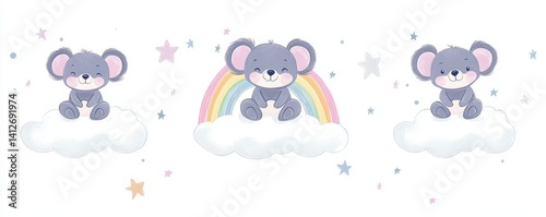 Fototapeta premium Two koalas are situated beneath rainbows that are floating on clouds accompanied by stars and hearts