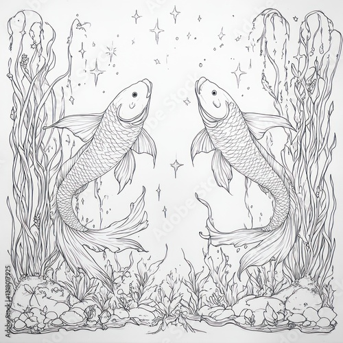 © hazia, Fototapeta premium Two Koi Fish Facing, Underwater, Stars, Line Art, Coloring Page
