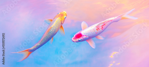 Fototapeta premium Two koi fish gracefully swimming in pastel-colored water.