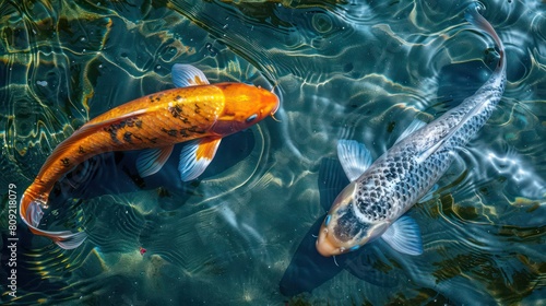 Fototapeta premium Two koi fish swimming gracefully in a shimmering pond
