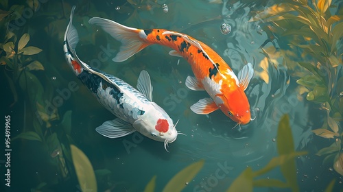 © Kanimalia, Fototapeta premium Two Koi Fish Swimming in a Pond.