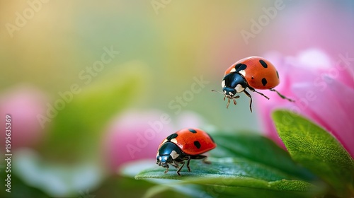 © Graciel, Obraz premium Two ladybugs in mid-flight, perched on a leaf.