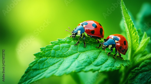 © Synthesia Studio, Fototapeta premium two ladybugs on a fresh green leaf in a vibrant natural setting for ecology and wildlife themes