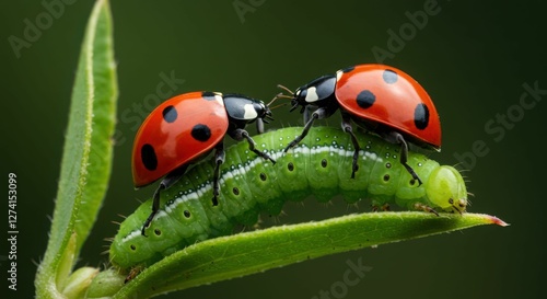 Fototapeta premium Two ladybugs on caterpillar on green leaf in natural setting