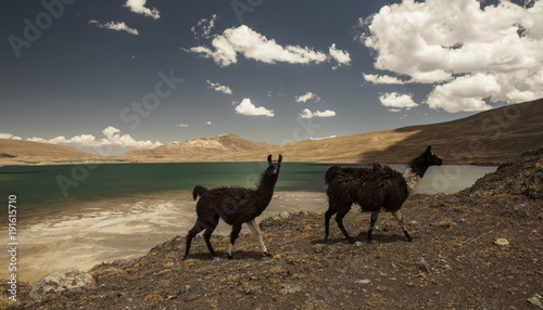 Fototapeta premium Two lamas crossing in front of a turquoise lake