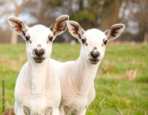 © MUDA, Fototapeta premium Two lamb faces in a field