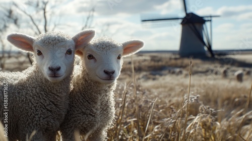 © Zeva, Fototapeta premium Two lambs in field, windmill background, rural spring scene, idyllic farm