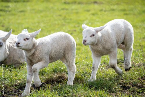Obraz premium Two lambs running in a field in the Netherlands