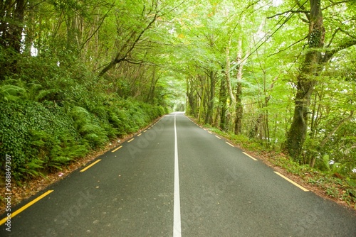 Fototapeta premium Two-lane paved road is stretching through flat design forest, with white line and ferns
