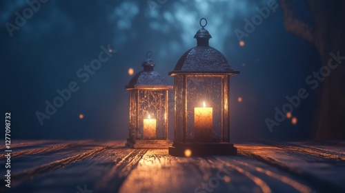 © MyStockz, Fototapeta premium Two Lanterns Illuminating a Foggy Night Scene with Warm Light