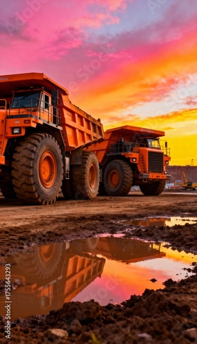 Obraz premium Two large orange mining trucks on muddy ground under vibrant sunrise or...