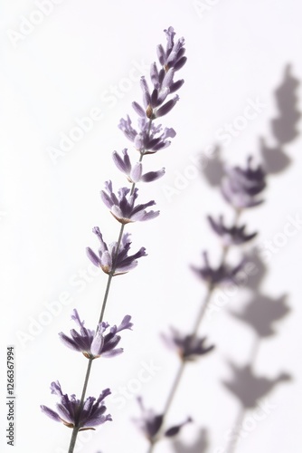 © BerkahStock, Naklejka premium Two lavender sprigs against a white background, casting shadows.