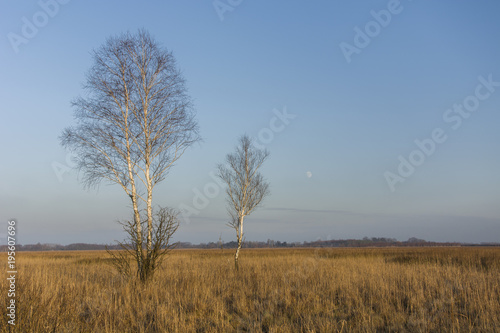 Fototapeta premium Two leafless birches and dry meadows