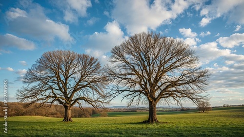 Fototapeta premium Two leafless trees standing in a rural landscape