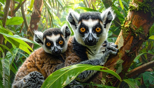 © Irma, Naklejka premium Two lemurs in a lush jungle