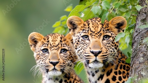 Naklejka premium Two leopard cubs peering from tree, lush green background, wildlife photography