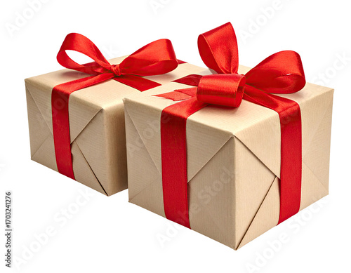 © Abu, Obraz premium Two light beige gift boxes, tied with red ribbon bows, sit side-by-side