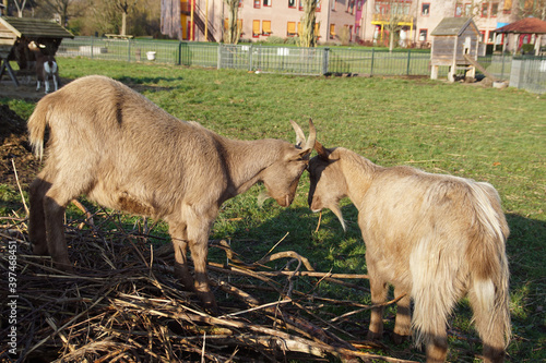 Fototapeta premium Two light brown goats together. Late autumn, December in the Netherlands.