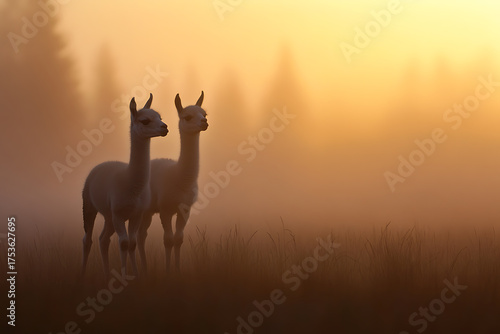 © twc, Obraz premium Two light-colored alpacas stand side by side in a grassy field, bathed in the warm golden light of sunrise, shrouded in a gentle mist. Serene and peaceful.