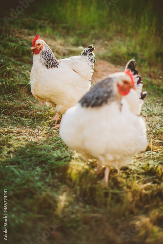 © Dale, Fototapeta premium Two Light Sussex chickens free ranging on farm in late afternoon light