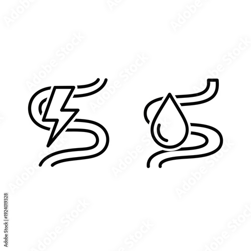 © MOSTPARVIN, Obraz premium Two line art icons representing concepts: a stylized lightning bolt within a winding path for electricity and a water drop on a path for fluid flow.