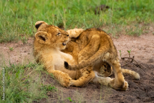 © Nick Dale, Naklejka premium Two lion cubs in grass play fight
