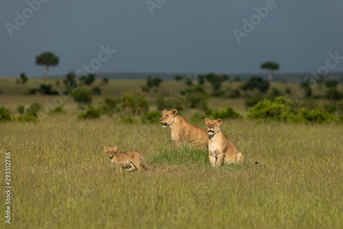 Fototapeta premium Two Lioness and Young Cub Seen at Masai Mara Game Reserve,Kenya,Africa