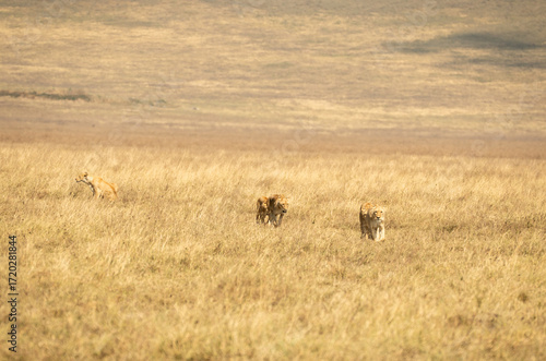 Naklejka premium Two lionesses walking through dry golden grassland in Ngorongoro Crater,...