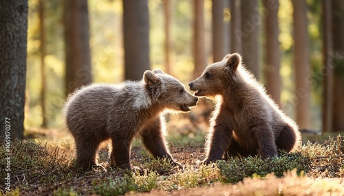 © dmnkandsk, Fototapeta premium Two little bears cubs playing with each other in the forest